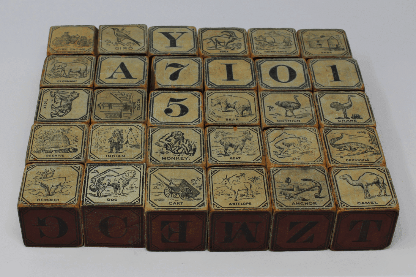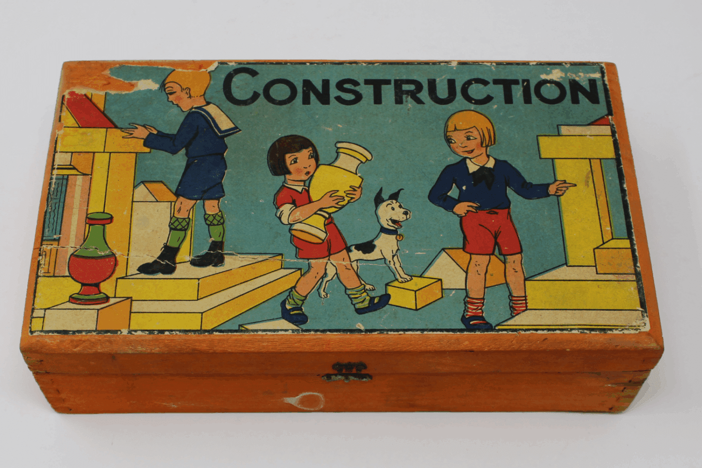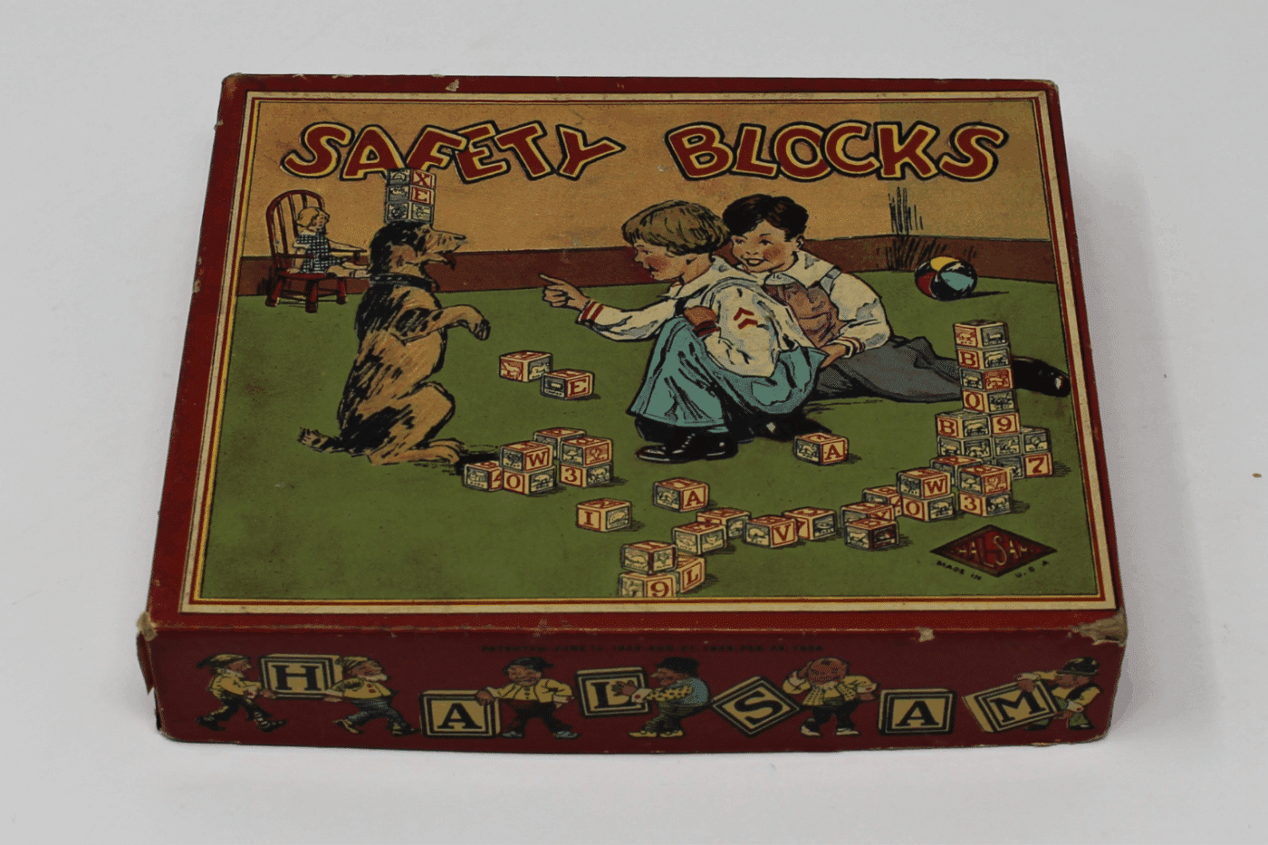 Take these toys, for example: the Museum’s Architectural Toy Collection holds items that teach children principles of design, architecture, and engineering through play. When learning about the most fundamental rules of physics and structure through alphabet blocks, toymakers included references to things and places young children would find familiar. A for Ape, B for Bear, C for Clock, and D for Dog. The exterior of toy boxes, intended to entice parents and children alike to choose this specific toy over another, featured happy images of children at play and their loyal dog companions participating joyfully. It’s clear that these pups were seen as integral to the quintessential childhood experience.