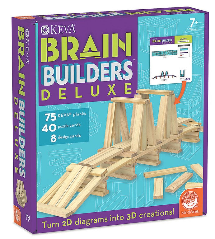 Even more challenges to train the brain with KEVA Brain Builders Deluxe. Combines 75 KEVA planks and 40 puzzle cards with a 2-D challenge shown from different angles on one side and its 3D solution on the other. Difficulty increases from beginner to master. As each build becomes more challenging, patience and confidence is gained through trial and error. Also includes 8 inspirational design cards with building tips to foster creativity. From snowmobiles and space rovers to hammerhead sharks and bridges, you will be amazed what your brain will build! Strengthens STEM, fine-motor, strategy, physics and basic engineering skills. A new and exciting way to experience KEVA planks. No glue or connectors needed. Ages 7 and up.