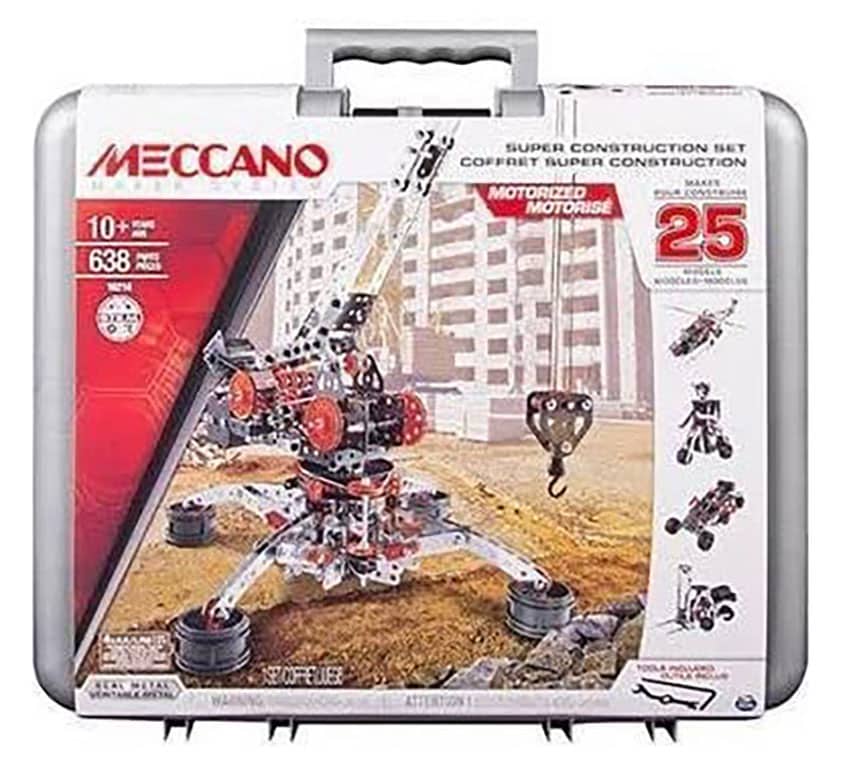 Let your child build 1 of 25 different construction vehicles (models can be built one at a time). Parts can be used to rebuild a helicopter, a buggy crane and much more or kids can mix match pieces for an original design. Build a motorized crane and bring it to life with the 6V electrical motor. Play with its rotary body and extendable hook! For over a hundred years, Meccano has been promoting children?s STEM (Science, Technology, Engineering, and Math) learning as they build and play. Includes: 640 + parts, 6V electrical motor, 1 carrying plastic case with storage compartments, 2 real tools, 1 instruction sheet. Ages 8+.
