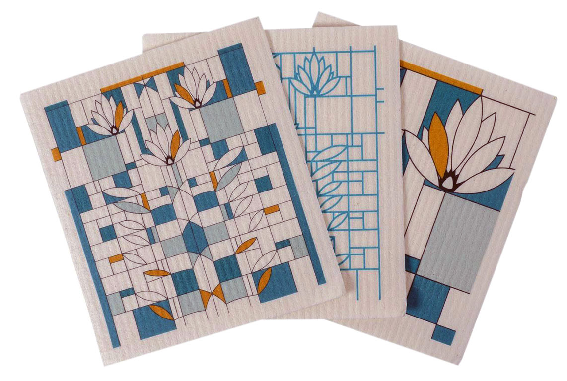 These printed cellulose sponge sets of 3 dish cloths; with designs inspired by iconic architect Frank Lloyd Wright; are perfect for cleaning counter tops, soaking up spills, and washing dishes. Their cellulose sponge construction makes them much more absorbent than a traditional cotton dish cloth.