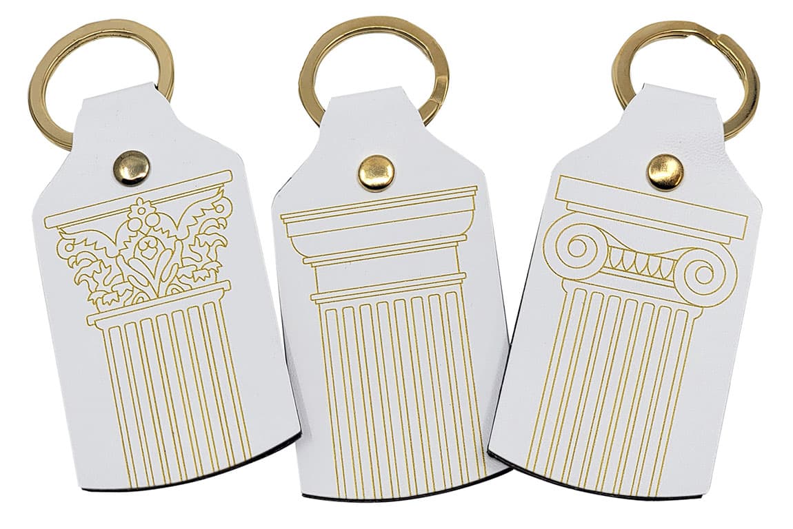 The National Building Museum is one of the architectural wonders of Washington, D.C. Some of the most recognized elements of architecture are arches and columns. Three of the most well-known Order of Architectural Columns present in the National Building Museum are Doric, Ionic, and Corinthian. The keychains feature one of the three columns printed in gold on white recycled leather and measure 3 x 1.5 inches with a gold ring.