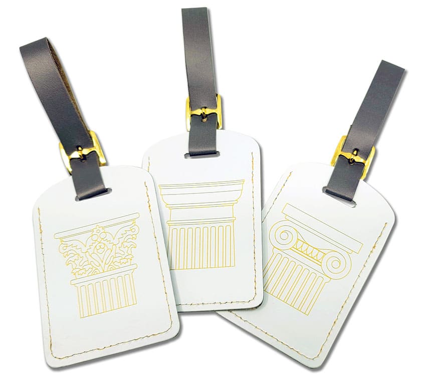 The National Building Museum is one of the architectural wonders of Washington, D.C. Some of the most recognized elements of architecture are arches and columns. Three of the most well-known Order of Architectural Columns present in the National Building Museum are Doric, Ionic, and Corinthian. The luggage tags feature one of the three columns printed in gold on white recycled leather and measure 4 x 2.5 inches with a 3.5” strap.