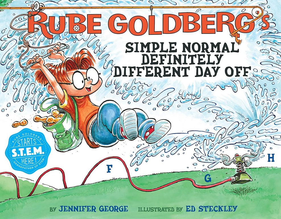 In?Rube Goldberg?s Simple Normal Definitely Different Day Off, follow along with the young inventor in this wacky, STEAM-focused picture book. ?A ?definitely different? follow-up to?Rube Goldberg?s Simple Normal Humdrum School Day, written by Jennifer George, the granddaughter of Rube Goldberg, and illustrated by Reuben Award-winning artist Ed Steckley.? In this collaboration, they imagine Rube Goldberg as a young inventor who builds complex machines to solve simple, everyday problems.? Follow along as he invents zany chain-reaction contraptions to have the best day off from school ever?including a simple way to play fetch in the yard without leaving his bedroom, a self-operating swing, and a super simple series of movie snacking machines.? Hardcover, 40 pages.? Ages 5-9 years.