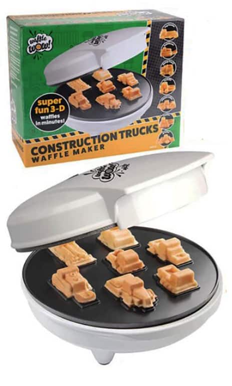 Construction Trucks Waffle Maker Iron. 7 unique and fun shapes featuring a log hauler, bulldozer, dump truck, forklift, steam roller, loader and grader. Non-stick electric for waffles in minutes. Fun for kids who are interested in building! Great for a little boy or girl’s birthday gift or special celebration!